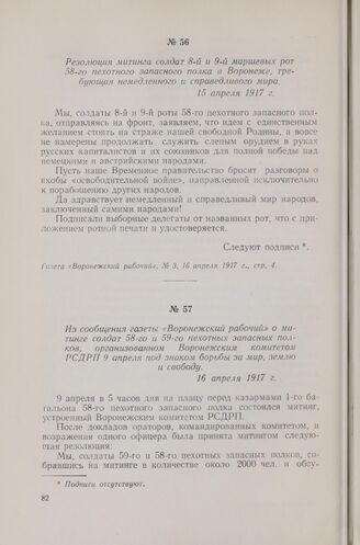 Из сообщения газеты «Воронежский рабочий» о митинге солдат 58-го и 59-го пехотных запасных полков, организованном Воронежским комитетом РСДРП 9 апреля под знаком борьбы за мир, землю и свободу. 16 апреля 1917 г. // Газета «Воронежский рабочий», № 3, 16 апреля 1917 г., стр. 3.