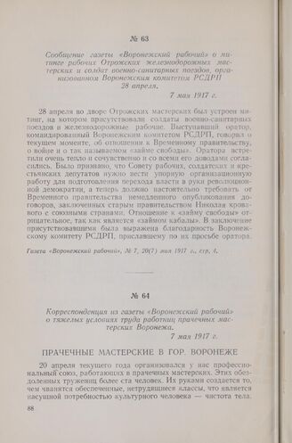Сообщение газеты «Воронежский рабочий» о митинге рабочих Отрожских железнодорожных мастерских и солдат военно-санитарных поездов, организованном Воронежским комитетом РСДРП 28 апреля. 7 мая 1917 г. // Газета «Воронежский рабочий», № 7, 20 (7) мая 1917 г., стр. 4.