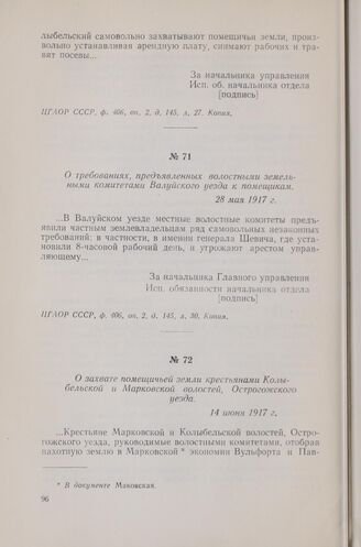 Из сведений, поступивших в Главное управление по делам милиции Министерства внутренних дел, о волнениях крестьян в Воронежской губернии. 17 мая-14 июня 1917 г. О захвате помещичьей земли крестьянами Колыбельской и Марковской волостей, Острогожского уезда. 14 июня 1917 г. // ЦГАОР СССР, ф. 406, оп. 2, д. 145, л. 75 об. Копия.
