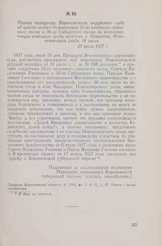 Приказ прокурора Воронежского окружного суда об аресте солдат-большевиков 52-го пехотного запасного полка и 30-го Сибирского полка за революционную агитацию среди крестьян с. Макарова, Новохоперского уезда 16 июля. 20 июля 1917 г. // Госархив Воронежской области, ф. 2393, оп. 1, д. 11, л. 47. Копия с копии, заверенная.