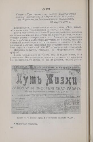 Газета «Путь жизни» по поводу клеветнической заметки, помещенной в «Воронежском телеграфе», на Воронежскую большевистскую организацию. 20 августа 1917 г. // Газета «Путь жизни», № 2, 1 сентября (20 августа) 1917 г., стр. 4.