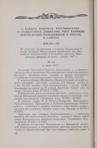Из сведений, поступивших в Главное Управление по делам милиции Министерства внутренних дел Временного правительства о волнениях крестьян Воронежской губернии за июль - август 1917 г. За июль 1917 г. // Крестьянское движение в 1917 году (1917 г. в документах и материалах под редакцией М. Н. Покровского, И. Я. Яковлева). Гиз. Москва, 1927 г., стр. 151-152.