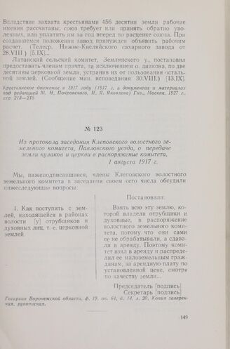 Из протокола заседания Клеповского волостного земельного комитета Павловского уезда, о передаче земли кулаков и церкви в распоряжение комитета, 1 августа 1917 г. // Госархив Воронежской области, ф. 19, оп. 64, д. 14, л. 20. Копия заверенная, рукописная.
