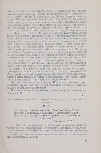 Резолюция общего собрания Острогожского Совета рабочих и солдатских депутатов о немедленной передаче власти в руки пролетариата и беднейших крестьян. 26 августа 1917 г. // ЦГАОР СССР, ф. 393, оп. 5. д. 34, л. 5. Копия заверенная, рукописная.