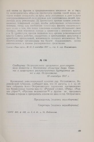 Сообщение Острогожского временного революционного комитета в Московское областное бюро Советов о запрещении распространения буржуазных газет в гор. Острогожске. 10 сентября 1917 г. // ГАОPCС МО, ф. 683, оп. 3, д. 46, л. 94. Подлинник.