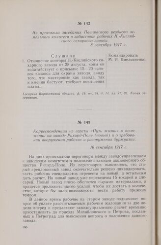 Корреспонденция из газеты «Путь жизни» о положении на заводе Рихард-Поле (новый) и о требовании вооружения рабочих и разоружения буржуазии. 10 сентября 1917 г. // Газета «Путь жизни», № 7, 23 (10) сентября 1917 г., стр. 4.