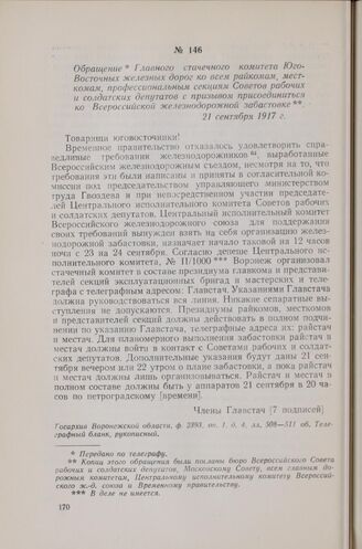 Обращение Главного стачечного комитета Юго-Восточных железных дорог ко всем райкомам, месткомам, профессиональным секциям Советов рабочих и солдатских депутатов с призывом присоединиться ко Всероссийской железнодорожной забастовке. 21 сентября 191...