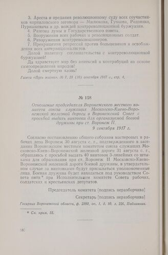 Отношение председателя Воронежского местного комитета союза служащих Московско-Киево-Воронежской железной дороги в Воронежский Совет с просьбой выдать винтовки для организуемой боевой дружины при ст. Воронеж II. 9 сентября 1917 г. // Госархив Воронежской области, ф. 2393, оп. 1. д. 10, л. 226. Подлинник.