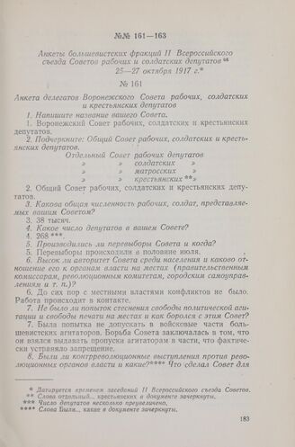 Анкеты большевистских фракций II Всероссийского съезда Советов рабочих и солдатских депутатов. 25-27 октября 1917 г. Анкета делегатов Воронежского Совета рабочих, солдатских и крестьянских депутатов // ЦГАОР СССР, ф. 1235, оп. 1, д. 9, лл. 27-28 и об. Подлинник рукописный. «Красный архив», № 5 (84), 1937 г., стр. 29.