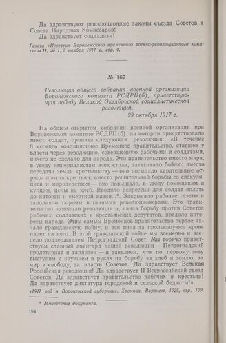 Резолюция общего собрания военной организации Воронежского комитета РСДРП(б), приветствующая победу Великой Октябрьской социалистической революции. 29 октября 1917 г. // «1917 год в Воронежской губернии». Хроника, Воронеж, 1928, стр. 129.