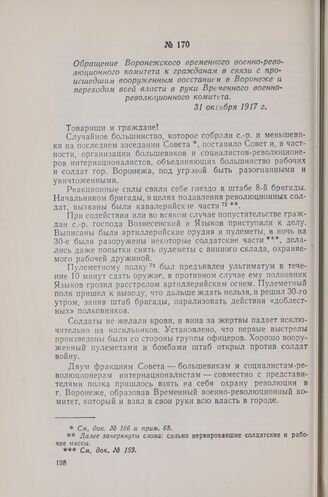 Обращение Воронежского временного военно-революционного комитета к гражданам в связи с происшедшим вооруженным восстанием в Воронеже и переходом всей власти в руки Временного военно-революционного комитета. 31 октября 1917 г. // Партархив Воронежского обкома КПСС, ф. 5, д. 170, л. 21 и об. Копия заверенная.