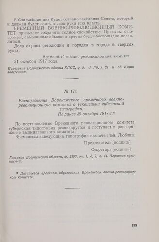 Распоряжение Воронежского временного военно-революционного комитета о реквизиции губернской типографии. Не ранее 30 октября 1917 г.
