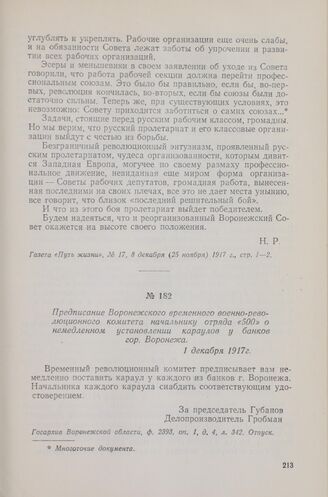 Предписание Воронежского временного военно-революционного комитета начальнику отряда «500» о немедленном установлении караулов у банков гор. Воронежа. 1 декабря 1917 г. // Госархив Воронежской области, ф. 2393, оп. 1, д. 4, л. 342. Отпуск.