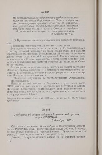 Из постановления объединенного заседания Исполнительного комитета Воронежского Совета и Временного военно-революционного комитета об упразднении Временного военно-революционного комитета, передаче всей полноты власти Совету и введении должностей комиссаров во всех учреждениях. 2 декабря 1917 г. // Госархив Воронежской области, ф. 2393, оп. 1, д. 15, лл. 51, 53. Черновик рукописный.