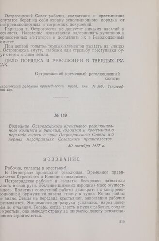 Воззвание Острогожского временного революционного комитета к рабочим, солдатам и крестьянам о переходе власти в руки Петроградского Совета и о первых мероприятиях Советского правительства. 30 октября 1917 г.