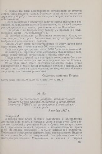 Письмо Острогожского уездного исполнительного комитета Совета рабочих, солдатских и крестьянских депутатов ВЦИКу об установлении Советской власти в уезде. 9 ноября 1917 г.
