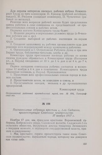 Постановление собрания крестьян с. 1-го Садового, приветствующее Советское правительство. 17 ноября 1917 г.