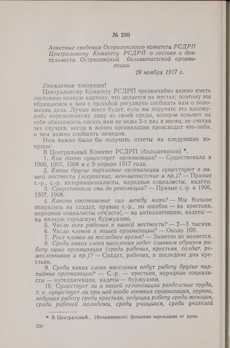 Анкетные сведения Острогожского комитета РСДРП Центральному Комитету РСДРП о составе и деятельности Острогожской большевистской организации. 29 ноября 1917 г.