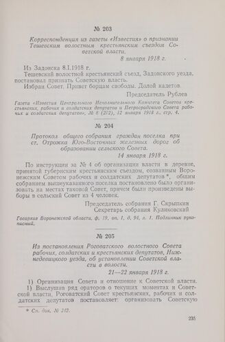 Протокол общего собрания граждан поселка при ст. Отрожка Юго-Восточных железных дорог об образовании сельского Совета. 14 января 1918 г. // Госархив Воронежской области, ф. 19, оп. 1, д. 94, л. 1. Подлинник рукописный.