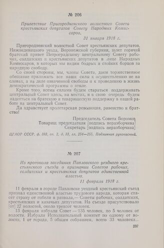 Из протокола заседания Павловского уездного крестьянского съезда о признании Советов рабочих, солдатских и крестьянских депутатов единственной властью. 11 февраля 1918 г.