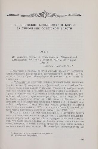 Из краткого отчета о деятельности Воронежской организации РКП(б) с октября 1917 г. по 1 июня 1918 г. Позднее 1 июня 1918 г. // Партархив Воронежского обкома КПСС, ф. 1, оп. 1, д. 1, лл. З-6. Ротаторный экз.
