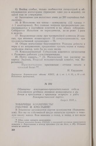 Обращение агитационно-просветительного отдела Землянского уездного военного комиссариата к рабочим и крестьянам с призывом вступать в ряды Коммунистической партии. Август 1918 г.