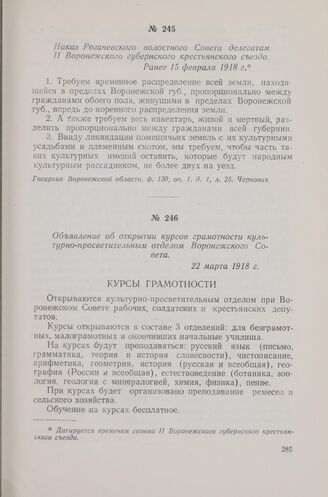 Объявление об открытии курсов грамотности культурно-просветительным отделом Воронежского Совета. 22 марта 1918 г. // Партархив Воронежского обкома КПСС, ф. 5, оп. 1, д. 171, л. 3. Типографский экз.
