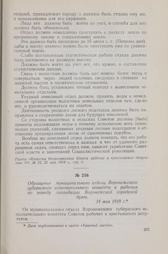 Обращение муниципального отдела Воронежского губернского исполнительного комитета к рабочим по поводу ликвидации Воронежской городской думы. 18 мая 1918 г. // Газета «Красный листок», № 8, 18 мая 1918 г., стр. 1-2.