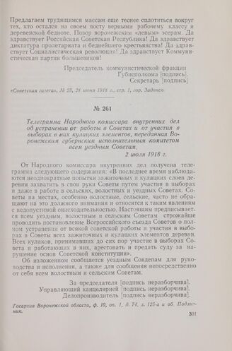 Телеграмма Народного комиссара внутренних дел об устранении от работы в Советах и от участия в выборах в них кулацких элементов, переданная Воронежским губернским исполнительным комитетом всем уездным Советам. 2 июля 1918 г. // Госархив Воронежской области, ф. 10, оп. 1, д. 74, л. 125-а и об. Подлинник.