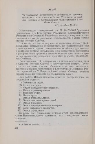 Из отношения Воронежского губернского исполнительного комитета всем отделам Исполкома и уездным Советам о реорганизации комиссариатов в отделы Совета. 12 сентября 1918 г. // Госархив Воронежской области, ф. 19, оп. 28, д. 7. л. 34 и об. Копия заверенная.