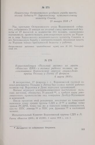 Приветствие Острогожского уездного съезда крестьянской бедноты Харьковскому исполнительному комитету Совета. 21 января 1918 г.