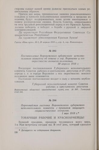 Постановление Воронежского губернского исполнительного комитета об отмене в гор. Воронеже и его окрестностях военного положения. 30 апреля 1918 г.