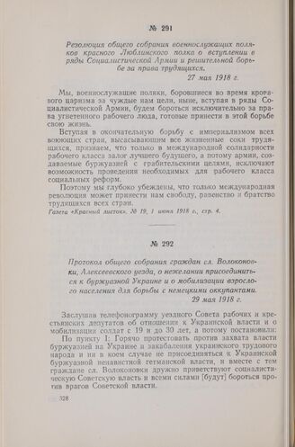 Резолюция общего собрания военнослужащих поляков красного Люблинского полка о вступлении в ряды Социалистической Армии и решительной борьбе за права трудящихся. 27 мая 1918 г. // Газета «Красный листок», № 19, 1 июня 1918 г., стр. 4.