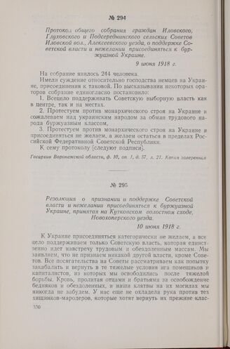 Резолюция о признании и поддержке Советской власти и нежелании присоединяться к буржуазной Украине, принятая на Кутковском волостном сходе Новохоперского уезда. 10 июня 1918 г.