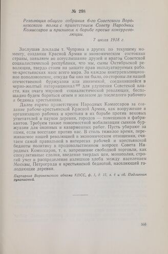 Резолюция общего собрания 6-го Советского Воронежского полка с приветствием Совету Народных Комиссаров и призывом к борьбе против контрреволюции. 7 июля 1918 г. // Партархив Воронежского обкома КПСС, ф. 1, д. 15, л. 4 и об. Подлинник рукописный.