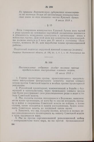 Постановление собрания солдат поляков против предательского выступления «левых» эсеров. 13 июля 1918 г. // Партархив Воронежского обкома КПСС, ф. 1, оп. 1, д. 19, л. 10. Подлинник.