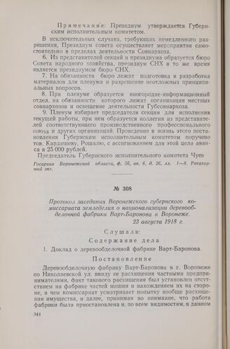 Протокол заседания Воронежского губернского комиссариата земледелия о национализации деревообделочной фабрики Варт-Баронова в Воронеже. 23 августа 1918 г. // Госархив Воронежской области, ф. 19. оп. 162, д. 8, л. 66. Копия заверенная.