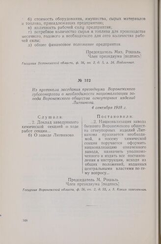 Из протокола заседания президиума Воронежского губсовнархоза о необходимости национализации завода Воронежского общества огнеупорных изделий Литвинова. 4 сентября 1918 г.