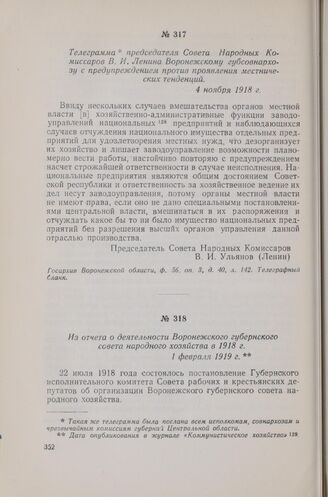 Из отчета о деятельности Воронежского губернского совета народного хозяйства в 1918 г. 1 февраля 1919 г.