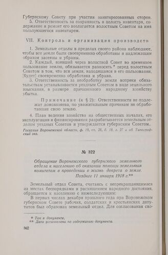 Обращение Воронежского губернского земельного отдела к населению об оказании помощи земельным комитетам в проведении в жизнь декрета о земле. Позднее 11 января 1918 г. // Госархив Воронежской области, ф. 19, оп. 28, д. 18, л. 8. Типографский экз.