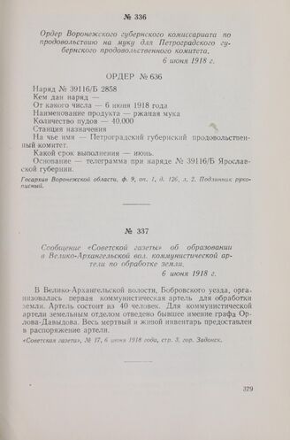 Сообщение «Советской газеты» об образовании в Велико-Архангельской вол. коммунистической артели по обработке земли. 6 июня 1918 г. // «Советская газета». № 17, 6 июня 1918 года, стр. 3, гор. Задонск.
