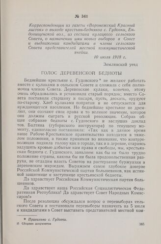 Корреспонденция из газеты «Воронежский Красный листок» о выходе крестьян-бедняков с. Гудовки, Ендовищенской вол., из состава кулацкого сельского Совета, о назначении ими новых выборов в Совет и выдвижении кандидатами в члены сельского Совета представителей местной коммунистической ячейки. 10 июля 1918 г. // Газета «Воронежский Красный листок», № 15, 10 июля 1918 г., стр. 4.