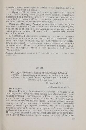 Из корреспонденции газеты «Воронежский Красный листок» о разоружении кулаков, проведении новых выборов в сельский Совет и организации комитетов бедноты в с. Гудовке. 25 июля 1918 г.