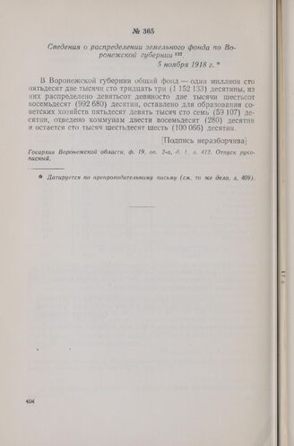 Сведения о распределении земельного фонда по Воронежской губернии. 5 ноября 1918 г. // Госархив Воронежской области, ф. 19, оп. 2-а, д. 1, л. 412. Отпуск рукописный.