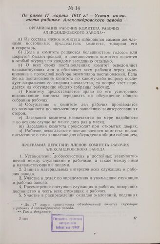 Не ранее 17 марта 1917 г. — Устав комитета рабочих Александровского завода