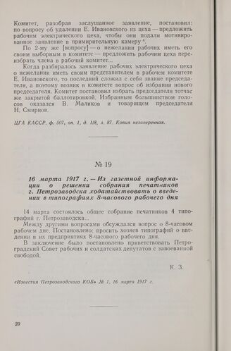 16 марта 1917 г. — Из газетной информации о решении собрания печатников г. Петрозаводска ходатайствовать о введении в типографиях 8-часового рабочего дня