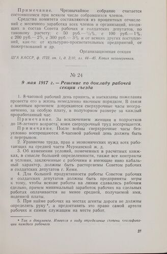 9 мая 1917 г. — Съезд делегатов рабочих, солдат и служащих средней части Мурманской ж. д. (Сорока-Кандалакша). Решение по докладу рабочей секции съезда // ЦГА КАССР, ф. 1722, оп. 1, д. 2/10, лл. 51—52. Копия незаверенная.