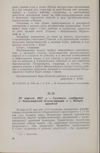 20 апреля 1917 г. — Газетное сообщение о первомайской демонстрации в г. Петрозаводске // «Известия Петрозаводского КОБ» № 27, 20 апреля 1917 г.
