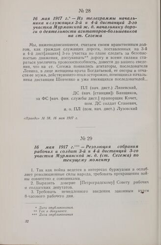 16 мая 1917 г. — Из телеграммы начальника и служащих 3-й и 4-й дистанций 3-го участка Мурманской ж. д. начальнику дороги о деятельности агитаторов-большевиков на ст. Сегежа // «Правда» № 58, 16 мая 1917 г.