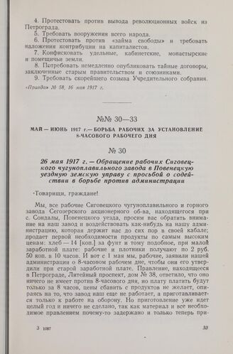 26 мая 1917 г. — Обращение рабочих Сиговецкого чугуноплавильного завода в Повенецкую уездную земскую управу с просьбой о содействии в борьбе против администрации // ЦГА КАССР, ф. 235, оп. 4, д. 1/1, л. 170. Подлинник рукописный.